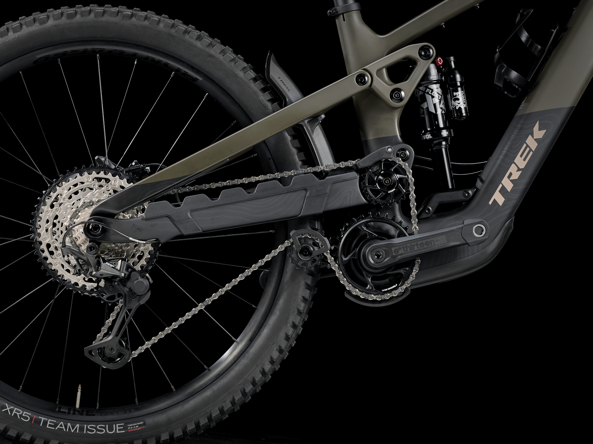 Un cadre en OCLV Mountain Carbon avec une suspension à pivot haut et un moteur HPR50 (50 Nm, 250 W), silencieux mais puissant, et une batterie de 580 Wh. Un débattement avant et arrière de 170 mm grâce à une fourche Fox Rythm 38 avec ressort pneumatique Float EVOL et amortisseur GRIP, et un amortisseur Fox Performance Float X. Des roues Bontrager Line Comp 30 Tubeless Ready rigides (29 po à l’avant et 27,5 po à l’arrière) pour gérer les terrains accidentés, une tige Line Dropper et une transmission Shimano SLX/TX.