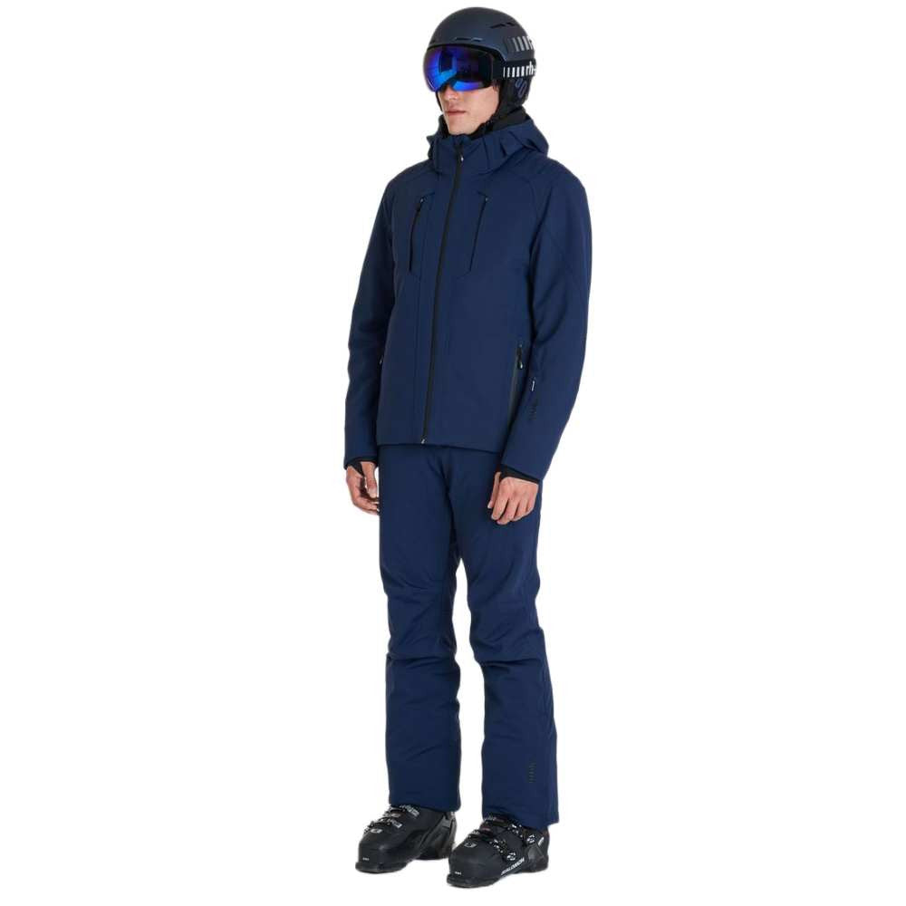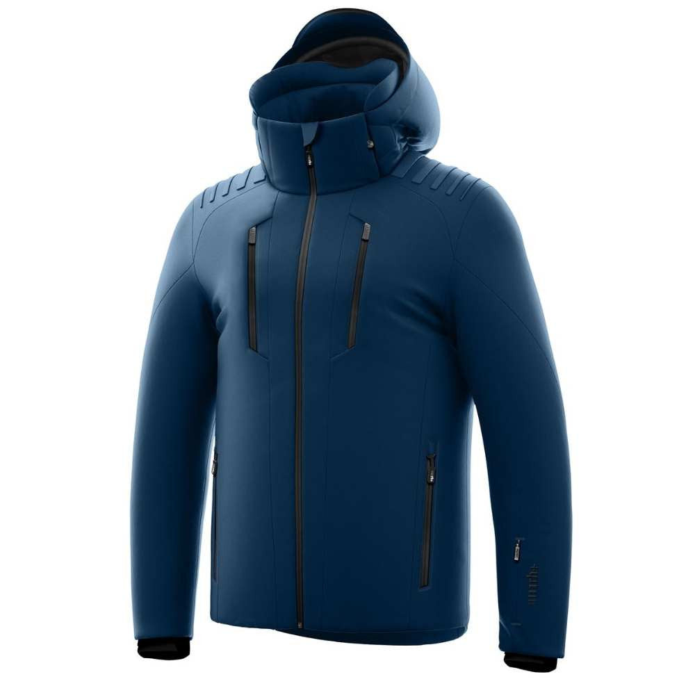 Cette veste technique est confectionnée en tissu extérieur Biomorphic Eco Knt 360° Adaptive Stretch, garantissant une élasticité et un confort optimaux. Entièrement étanche grâce à ses coutures thermosoudées, elle offre une protection maximale contre les intempéries. Les manches préformées et l'ourlet profilé avec cordon de serrage intérieur permettent un ajustement parfait. La capuche ajustable, amovible par une fermeture éclair dorsale, est dotée d'un bouton-pression pour la maintenir en place. La jupe Soft Shell assure une protection efficace contre le vent, tandis que les fermetures éclair frontales et celles des poches étanches sont équipées de tirettes personnalisées. Des aérations latérales avec zips invisibles améliorent la respirabilité. Les poignets intérieurs sont munis de passe-pouces ergonomiques. La veste intègre une guêtre intérieure fixe avec élastique antidérapant, des protections d'épaules surélevées et des empiècements en mesh dans le dos pour une plus grande liberté de mouvement. Des poches intérieures pour téléphone portable et lunettes de ski complètent le vêtement.