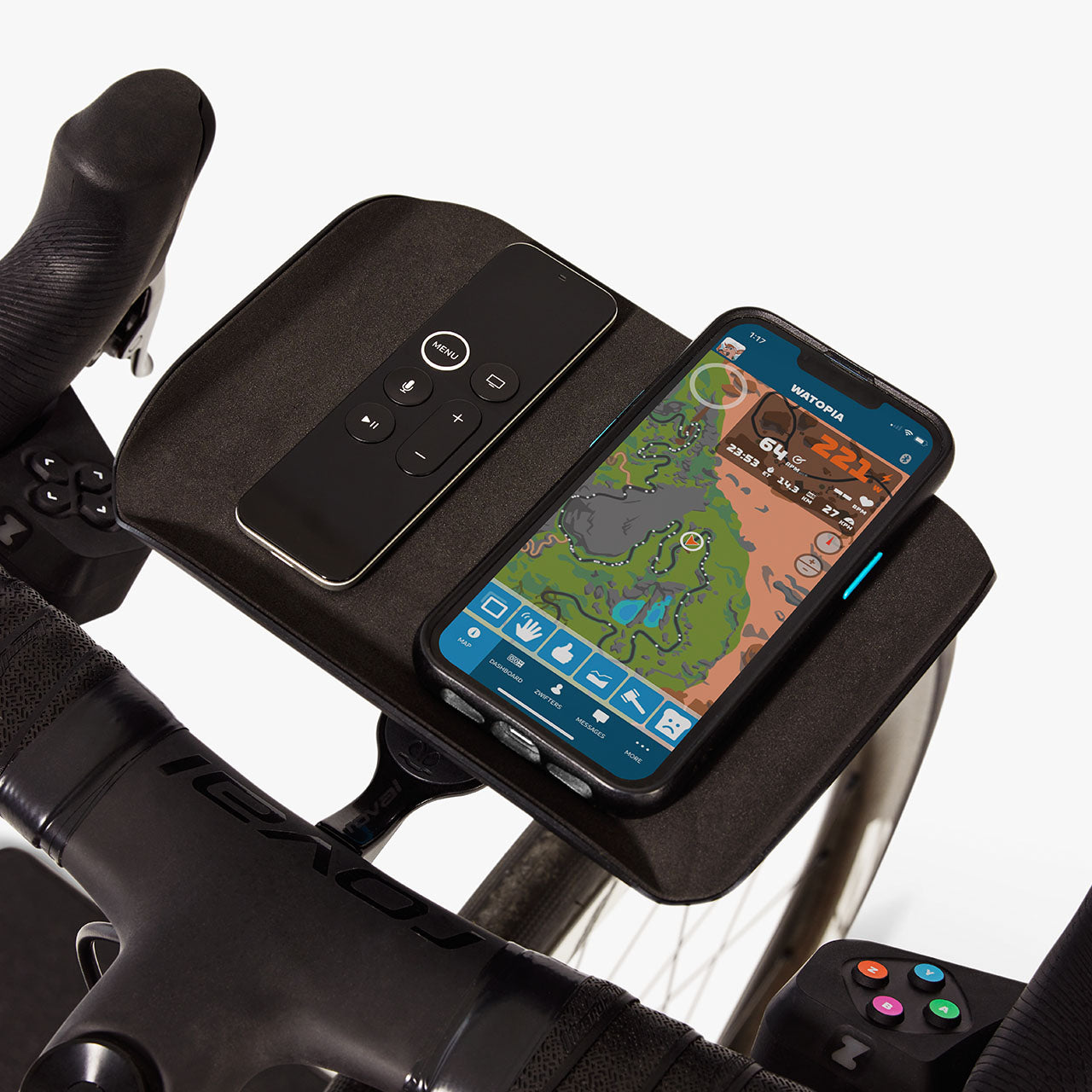 Le Trainer Tray est rapide et facile à installer - il suffit de le verrouiller en place sur votre support Garmin ou Wahoo existant. Fixé au guidon de votre vélo, il est idéalement placé pour atteindre les appareils et les télécommandes pendant l'entraînement. Grâce à son coussin antidérapant, vos objets resteront en sécurité, même pendant les efforts les plus intenses. Plus besoin de se pencher pour attraper la télécommande sur un tabouret ou de fouiller dans les poches de la veste, c'est le confort ultime.