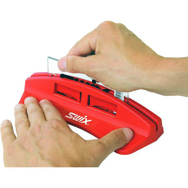 Outil d'affûtage de qualité professionnelle pour grattoir en plexiglas, avec une lime Panzer de 100 mm de haute qualité. Un grattoir bien affûté est essentiel pour le fartage des skis. Il permet de racler la semelle avec moins d'effort, réduisant ainsi le risque de l'endommager. Il optimise également le flux de travail en cabine de fartage. Facile d'utilisation, cet outil est doté de deux parois latérales qui le stabilisent et garantissent une grande précision. Compatible avec tous les grattoirs en plexiglas de 5 mm d'épaisseur ou moins. Des trous de fixation permettent une installation facile sur un établi ou un mur.